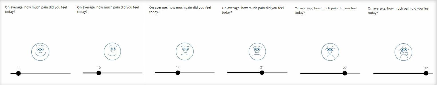 Among many other question types, Avicenna's research tool allows the use of VAS questions. Researchers can take advantage of the user-friendly survey to adjust their VAS questions towards achieving their desired outcome. With Avicenna, you can set the scale's limitation to whatever number you need, change the labels that determine respondents' selected value, and choose either a horizontal or a vertical layout for the scale. Imagine you want to add a pain scale to your survey to monitor participants' pain levels daily. Using images as labels in VAS questions can further increase the appeal and inclusiveness of your study, and Avicenna always strives to offer the best research tool features. To create a comprehensive pain scale in Avicenna, we are using six images representing the increasing level of discomfort. Here's how to modify your VAS question for that: