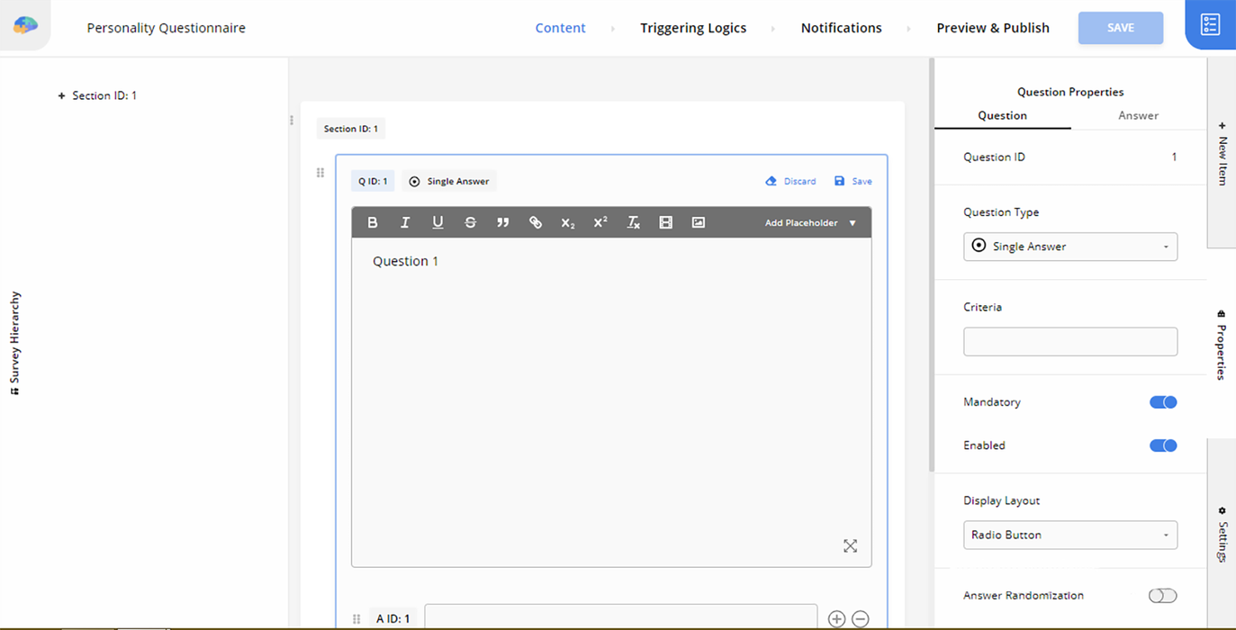 To continue with our example, first, you will need to add some questions and modify their settings while in the Content section. Complete your questionnaire however you see fit. Be sure to turn the Mandatory toggle on for each question because the answers will be needed for the User TL.