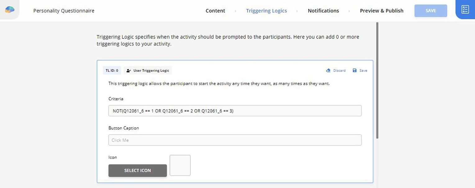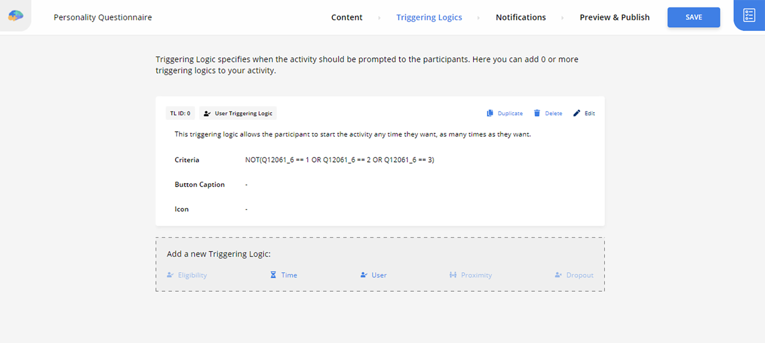 Now it's time to start scheduling how to prompt users to take the survey. For our questionnaire to be accessible to participants until it is answered, we need to add a User TL and adjust it for this purpose. Click on Triggering Logics from the top menu. This will open a window to modify the settings of different triggering logics. You can read more about TLs in general on the Triggering Logics page. For our purpose, we need to have a User TL. You can either add one from the bottom menu by clicking on its icon, or edit the default User TL already provided.