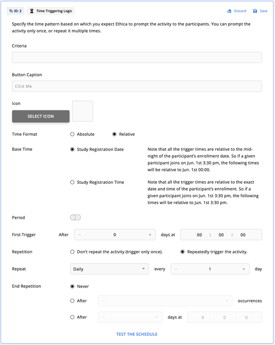 For some studies, you might want to notify the participants to take a survey, or complete a cognitive task, more than once a day. In such cases, you should use multiple Time Triggering Logics (or Time TL, for short). Fortunately, Avicenna has made it possible to add more than one Triggering Logic to your study.