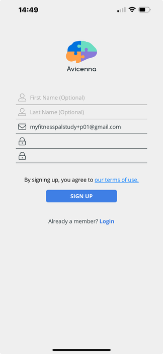 The first two (names) are optional, but the email address and password are mandatory. The participant will use these credentials every time they want to access the app.